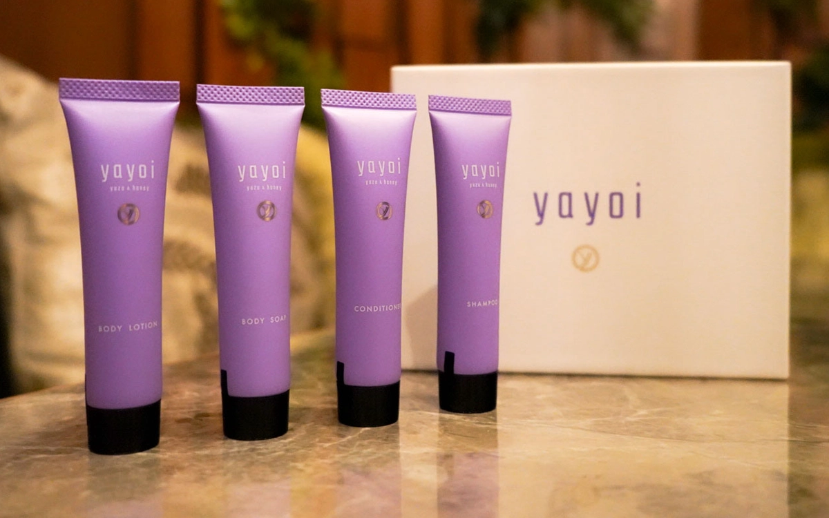 일류 호텔도 도입하는 바디 케어 브랜드 「yayoi(야요이)」의 세면도구 4점 세트(샴푸・컨디셔너・보디 소프・보디 크림)를 특별히 방에 준비하고 있습니다.