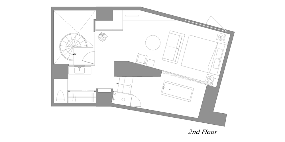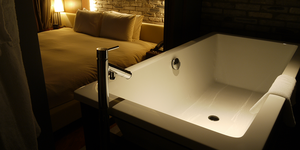 세련된 목제 다리 욕조가 들여다 보는 욕실을 침대 공간과 일체 공간으로 한 장난기 넘치는 레이아웃.